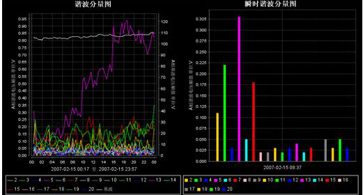 系統(tǒng)能監(jiān)測各通道多達50次諧波和50次間諧波含量、幅值、角度、功率等數(shù)據(jù),并進行本地和數(shù)據(jù)庫存儲,隨時進行調(diào)出以表格或曲線方式進行分析。